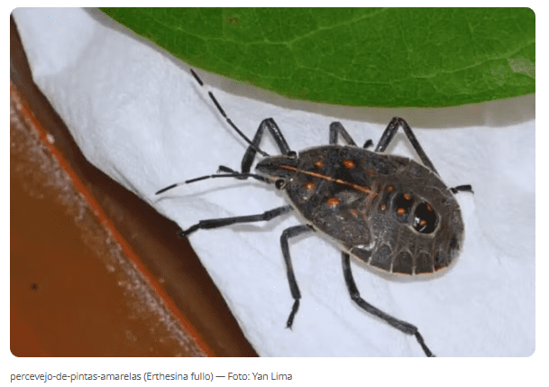 O percevejo-de-pintas-amarelas (Erthesina fullo), uma espécie originária da China, tem chamado a atenção de especialistas devido à recente aparição em cidades do litoral paulista, como Santos, São Vicente e Guarujá. O inseto, que é considerado uma praga na Ásia, já foi registrado 22 vezes na Baixada Santista, com maior incidência em Santos.
