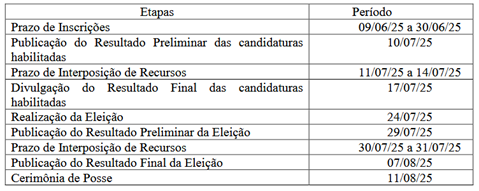 Com a prorrogação das inscrições, as demais etapas do Calendário Eleitoral sofreram alterações, como segue: