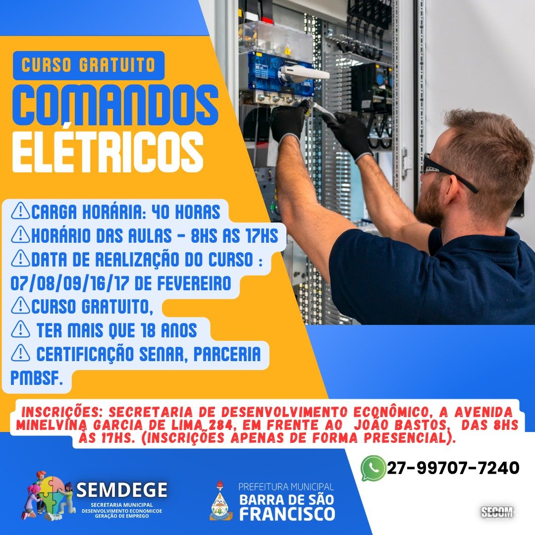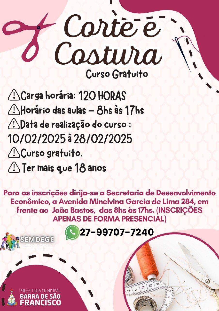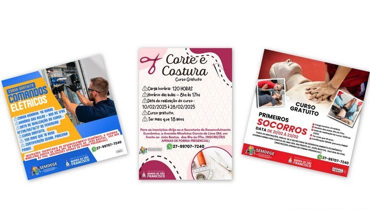 A Prefeitura de Barra de São Francisco, por meio da Secretaria Municipal de Desenvolvimento Econômico, Geração de Emprego e Renda (SEMDEGE), está disponibilizando três cursos gratuitos para os moradores francisquenses. Os cursos oferecem oportunidade de capacitação profissional em diferentes áreas e possuem vagas limitadas. Confira os detalhes: