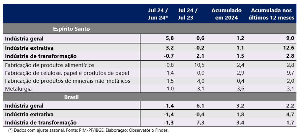De acordo com a pesquisa de Produção Industrial Mensal (PIM-PF) do IBGE, divulgada nesta sexta-feira (13), compilada pelo Observatório da Indústria da Federação das Indústrias do Espírito Santo (Findes), em julho, a indústria extrativa capixaba avançou 3,2% e a indústria de transformação teve um pequeno recuo de 0,8%, após registrar crescimento em junho (+4,9%).
