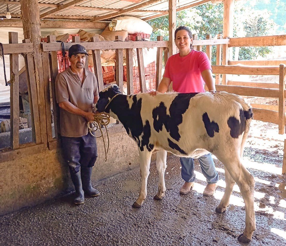 Na região do Caparaó, município de Guaçuí, o produtor Rogério Peixoto celebra os nove meses de duas bezerras. Ele conta com a assistência da extensionista Lorena Ribeiro, que o orienta sobre as práticas de manejo adequadas a animais nessa fase.