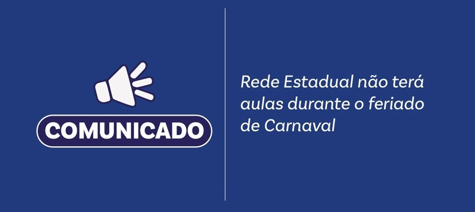 A Secretaria da Educação (Sedu) informa que, conforme previsto no Calendário Escolar 2026, não haverá aulas nas escolas da Rede Pública Estadual na segunda-feira (16), na terça-feira (17) e na quarta-feira (18), em razão dos pontos facultativos de Carnaval e da Quarta-feira de Cinzas.