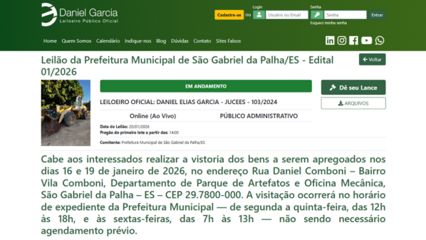 O leilão ocorrerá exclusivamente de forma online, a partir das 14h, por meio da plataforma do leiloeiro oficial Daniel Elias Garcia, matriculado sob o nº 103/2024 na Junta Comercial do Estado do Espírito Santo (JUCEES). Os bens disponíveis para arremate estão descritos detalhadamente nos editais, que podem ser consultados no site do leiloeiro.