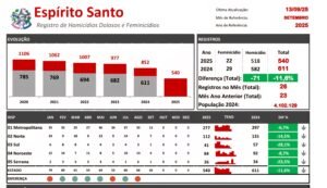 Para efeito de comparação, a taxa por 100 mil habitantes do Espírito Santo projeta nesse período para o ano é de 18,76 homicídios. O Estado tem, até o momento, 540 homicídios até 13 de setembro. Redução de 11,6% no período.