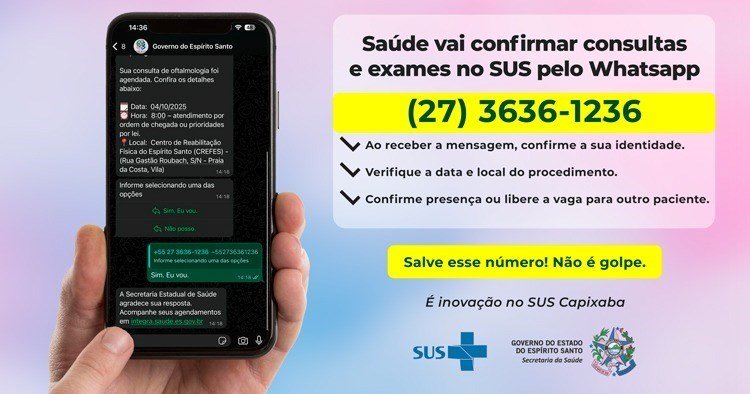 Os pacientes do Sistema Único de Saúde (SUS) do Espírito Santo vão confirmar a presença em consultas e exames por mensagem no WhatsApp (27) 3636-1236 do Governo do Estado. De qualquer lugar, eles vão poder desmarcar ou confirmar procedimentos médicos, sem precisar ir à unidade básica de saúde, poupando tempo e deslocamentos.