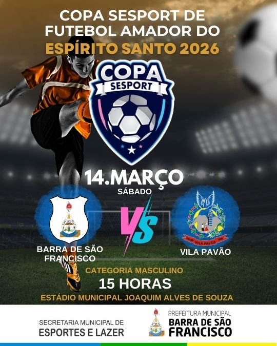 A equipe masculina da Seleção de Barra de São Francisco faz sua estreia neste sábado (14) na Copa Sesport de Futebol Amador do Espírito Santo. A partida será realizada às 15 horas, no Estádio Municipal Joaquim Alves de Souza, localizado no bairro Campo Novo. O adversário da estreia será a equipe de Vila Pavão. O confronto será válido pelo jogo de ida do confronto eliminatório. A partida de volta está marcada para o dia 21 de março, no município de Vila Pavão.