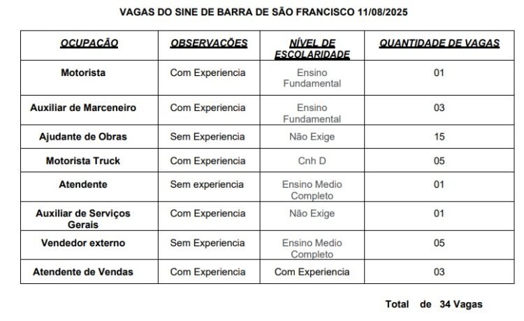 A agência do Sine de Barra de São Francisco abriu a segunda semana de agosto com 34 vagas de empregos formais. Há vagas para motorista, ajudante de obras, atendente, vendedor, entre outras. (Confira todas as vagas no final do texto).