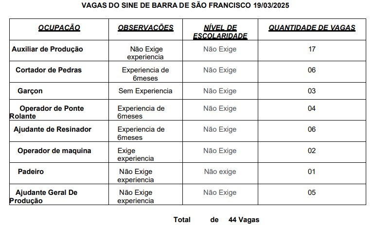 A agência do Sine de Barra de São Francisco está com 44 vagas de empregos formais disponíveis em vários setores. Há vagas de padeiro, graçon, auxiliar de produção, entre outros. (Confira todas as vagas no final do texto).