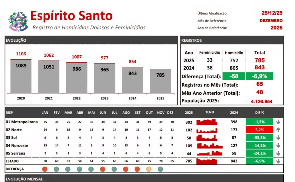 Sem contar o crime da Serra, o Espírito Santo registrou 785 homicídios até o dia 25 de dezembro, uma redução de 6,9% em relação ao mesmo período de 2024. O mês de dezembro registrfa um aumento acelerado nos crimes intencionais contra a vida no Estado, com aumento de 35% em relação a dezembro de 2024.