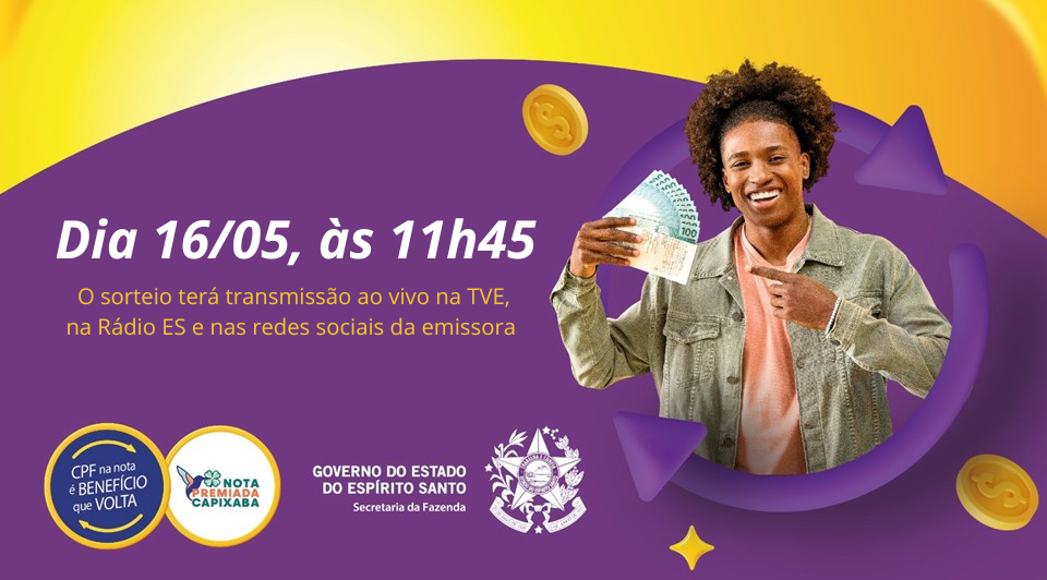 A sorte vai chegar mais cedo para os participantes do Nota Premiada Capixaba neste mês de maio. Devido aos feriados de Colonização do Solo Espírito-santense (23) e Corpus Christi (30), o 29º sorteio do programa acontecerá nesta quinta-feira (16), às 11h45, com transmissão ao vivo na TVE, na Rádio Espírito Santo e também nas redes sociais da emissora.