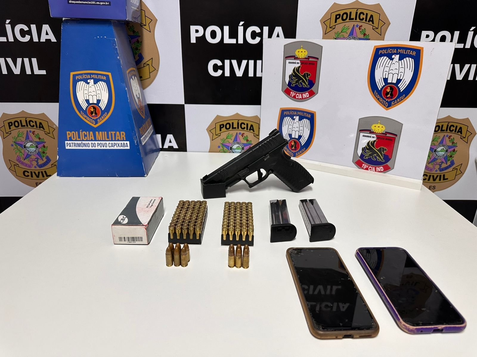A Polícia Civil informou que, durante a ação, o suspeito ainda tentou fugir pulando muros de residências vizinhas, mas foi alcançado e detido pelas equipes policiais. No imóvel utilizado por ele, foram apreendidos uma pistola calibre 9mm, de fabricação croata, e 112 munições intactas do mesmo calibre.