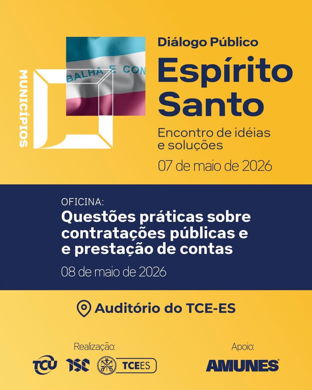 Nos dias 7 e 8 de maio, o Tribunal de Contas da União (TCU) realiza, em Vitória (ES), a penúltima edição do ano do evento Diálogo Público – Encontro de Ideias e Soluções. A iniciativa é voltada à capacitação de prefeitos (as), gestores (as) e servidores (as) municipais, e fruto de uma parceria com o Tribunal de Contas do Estado do Espírito Santo (TCE-ES), com apoio da Associação dos Municípios do Estado do Espírito Santo (Amunes).