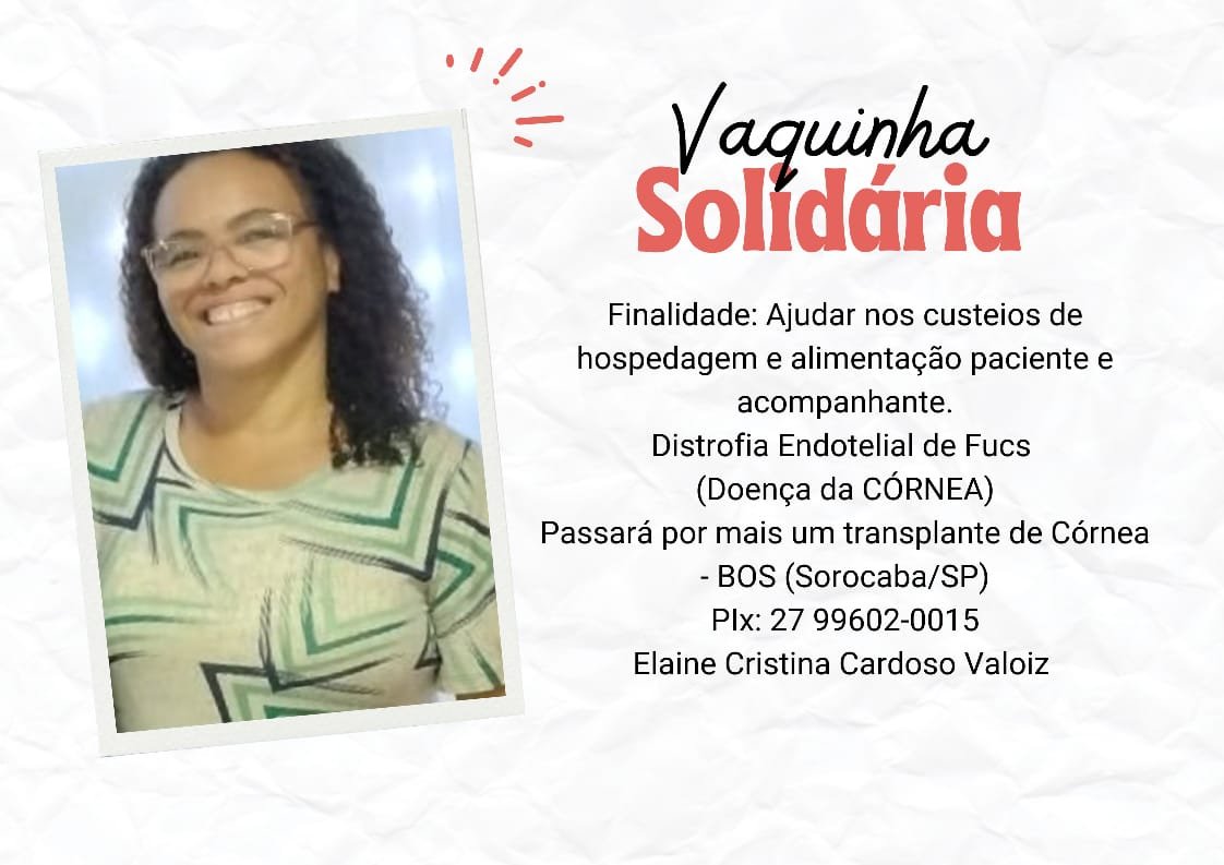 A família da Elaine Cristina Cardoso Valoiz está fazendo uma vaquinha, para custear despesas em relação à cirurgia de transplante de córnea, que ela teve que fazer, em um hospital de Sorocaba, São Paulo.