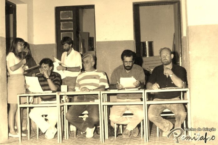 » Debate entre os candidatos a deputados em 1988 com o tema ‘Emancipação política de Vila Pavão’. Da esquerda para a direita: Norma Fleischman, Isaura Ramlow, Jorge Kuster Jacob (em pé, camisa branca), Nanquim (candidato deputado estadual), Antônio Moreira (candidato a deputado), Wilson Venturim, o Japonês (candidato a deputado) e Isaltino Venturim (candidato a deputado)